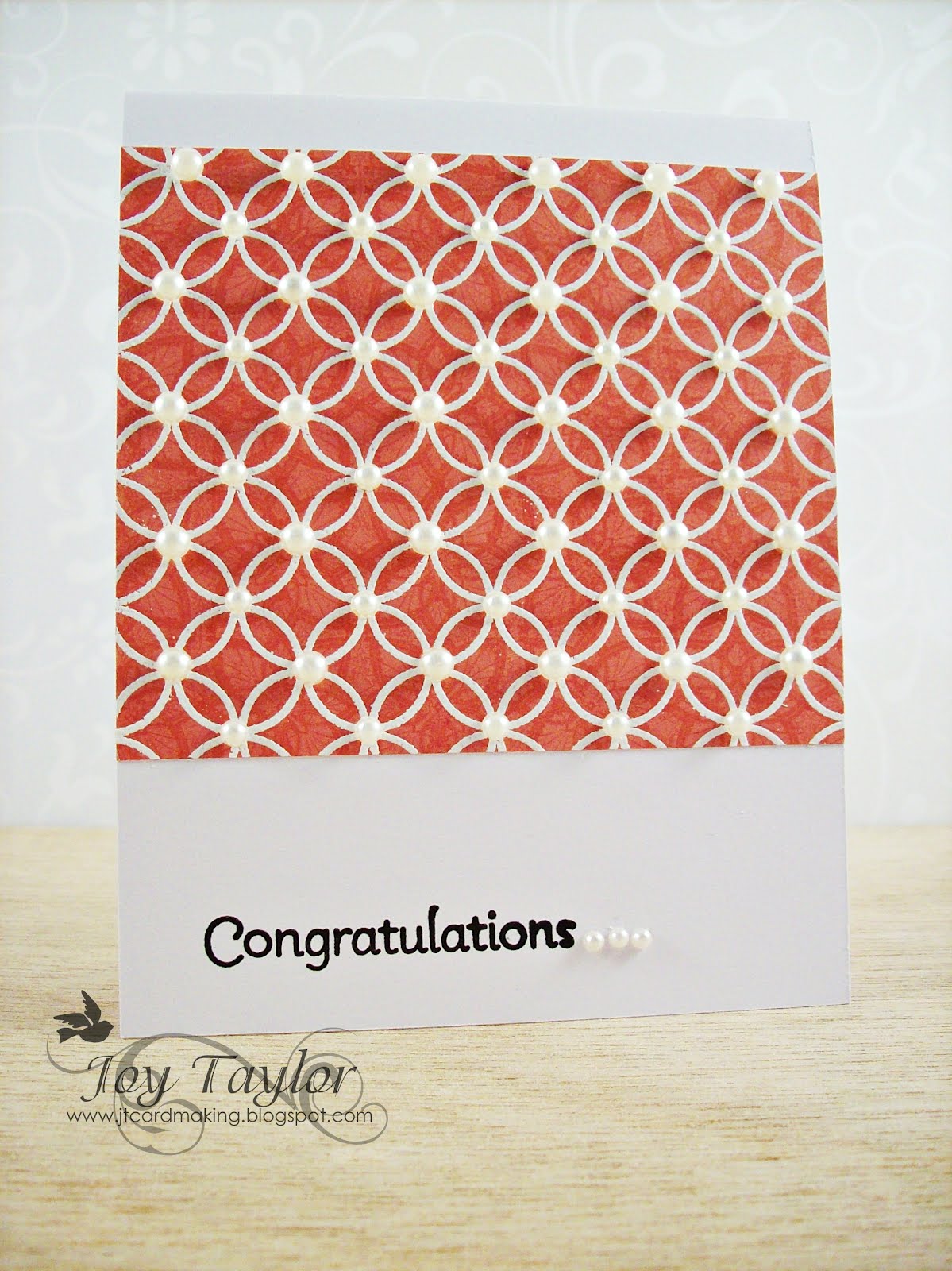Stamping a background stamp from Penny Black onto pattern paper, embossing with white embossing powder, and adding lots of pearls for elegance, finishing off with a sentiment…