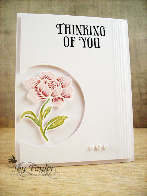 Lots of white on white, which I love, scoring down one side, die cutting a circle shape from one side of the card stock and adding in a flower that was stamped with Distress Markers and die cut out, finishing off with a sentiment and pearls.  All the products I used are at the base of this post…